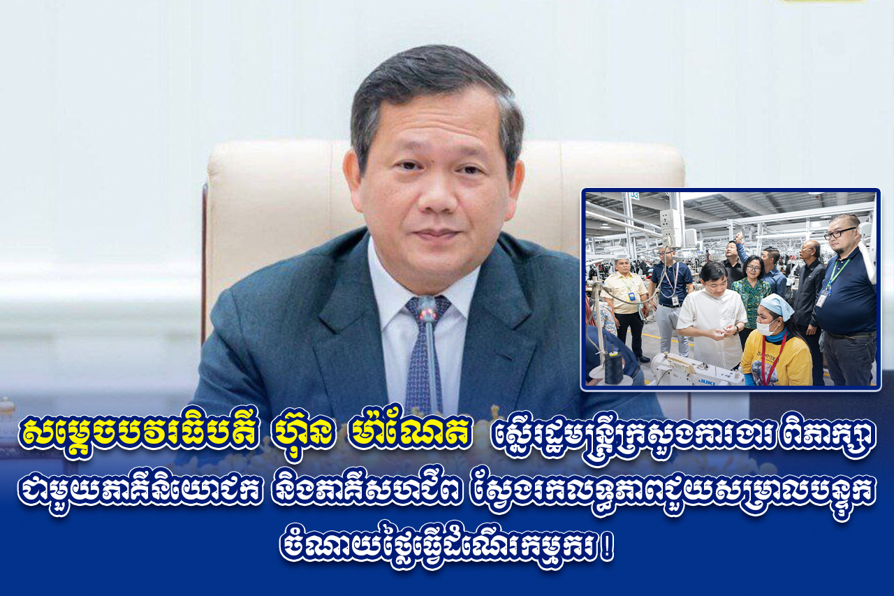 រាជធានីភ្នំពេញ៖ សម្តេចបវរធិបតី ហ៊ុន ម៉ាណែត នាយករដ្ឋមន្ត្រីកម្ពុជា បានស្នើឲ្យរដ្ឋមន្ត្រីក្រសួងការងារ រៀបចំកិច្ចប្រជុំជាមួយតំណាងភាគីនិយោជក និងភាគីសហជីព ដែលតំណាងបងប្អូនកម្មករនិយោជិត ដើម្បីពិនិត្យពិភាក្សាស្វែងរកការជួយសម្រាលបន្ទុកលើការចំណាយថ្លៃធ្វើដំណើររបស់បងប្អូនកម្មករនិយោជិត ។