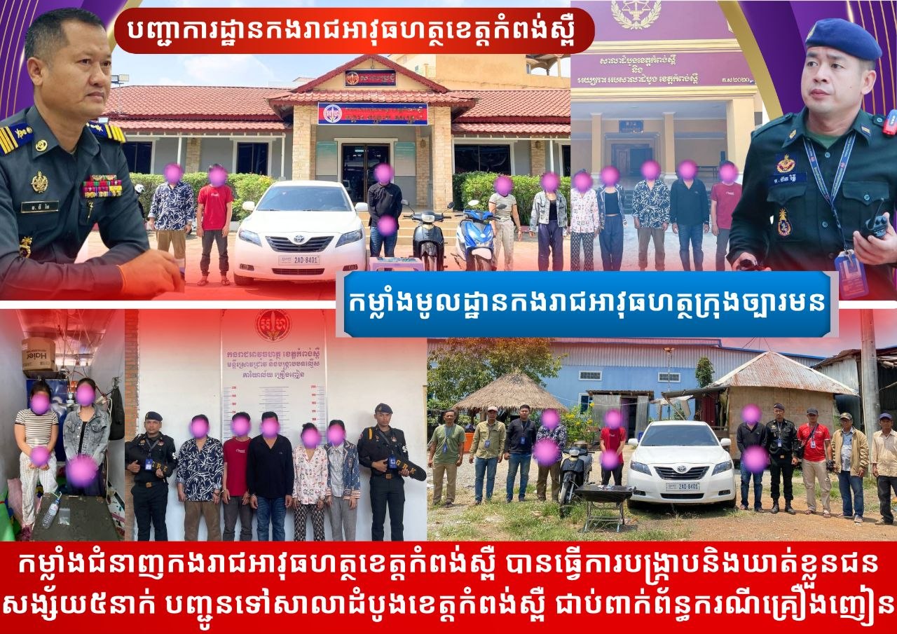 ដោយអនុវត្តតាមបទបញ្ជាយ៉ាងម៉ឺងម៉ាត់របស់លោកឧត្តមសេនីយ៍ត្រី ម៉េង ស្រ៊ុន មេបញ្ជាការ កងរាជអាវុធហត្ថខេត្តកំពង់ស្ពឺ និងមានការសម្របសម្រួលនីតិវិធីពី ឯកឧត្ដមព្រះរាជអាជ្ញា អមសាលាដំបូងខេត្តកំពង់ស្ពឺ កម្លាំងជំនាញកងរាជអាវុធហត្ថខេត្តកំពង់ស្ពឺ បានធ្វើការបង្ក្រាបនិងឃាត់ខ្លួនជនសង្ស័យ បញ្ជូនទៅសាលាដំបូងខេត្តកំពង់ស្ពឺ ជាបន្តបន្ទាប់ជាប់ពាក់ព័ន្ធករណីគ្រឿងញៀនក្នុងភូមិសាស្ត្រខេត្តកំពង់ស្ពឺនាពេលកន្លងមក